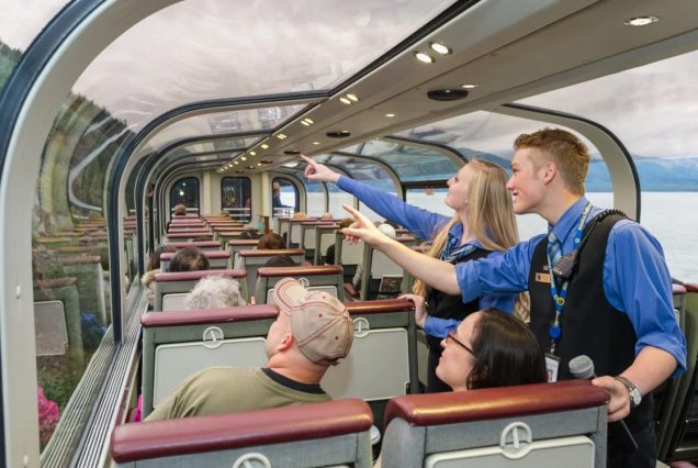 Второе — комфортом. Мы поедем в вагоне Gold Star Service — «золотой класс». Это специальный вагон с комфортными сиденьями и, самое главное, панорамными стёклами почти во всю ширину вагона! Обзор фантастический, а на Аляске это и есть самое главное! Кроме того, есть возможность выйти наверх, на обзорную площадку, чтобы увидеть ещё больше. А во время пути пассажиров угощают завтраками и ужинами исключительного качества. Кстати, напитки в сервис также включены, причём не только безалкогольные 🥂